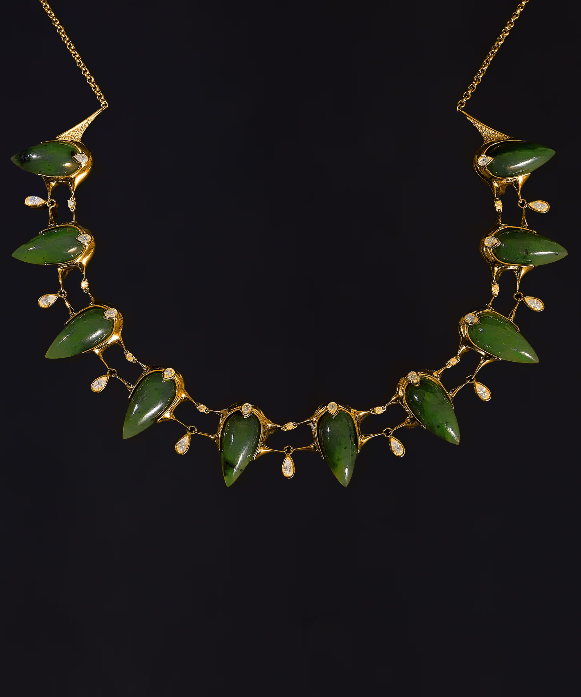 Камни в этом ожерелье напоминают клыки большой кошки — символы дикой силы, грации и внутренней мощи, которую несут в себе великие женщины, правившие миром.